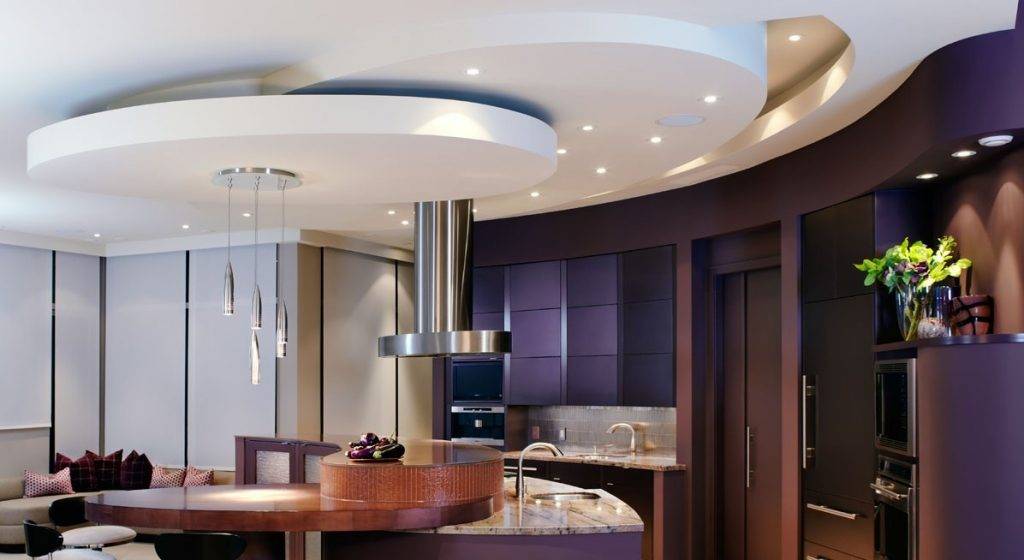 При разработке дизайн-проекта подвесного потолка из гипсокартона в двух уровнях, профессионалы предлагают следующие варинаты конструктивных решений: