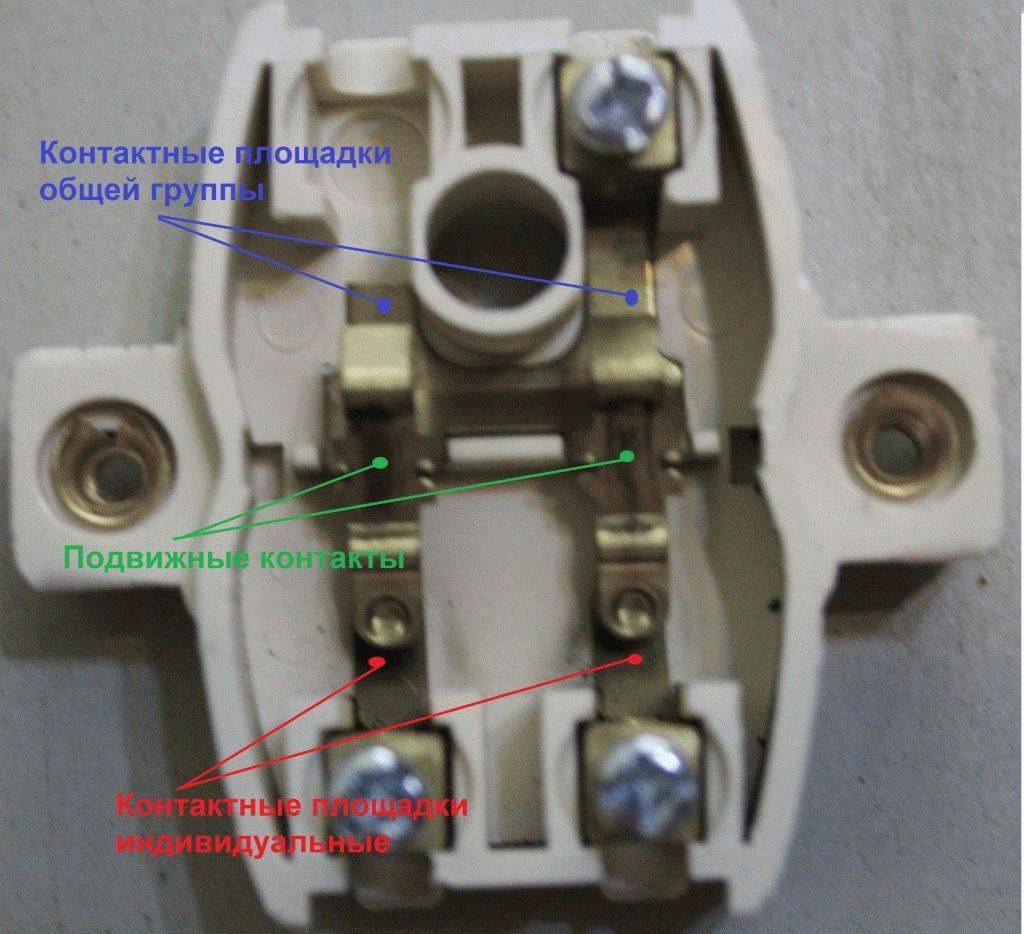 Осталось одно коромысло развернуть на 180 градусов, контактную площадку общей группы срезать (изолировать лучше не стоит). Результирующее положение показано на последнем снимке. Теперь завершающий этап – как все это работает!? Берем обе кнопки, склеиваем китайским пистолетом, чтобы стали единым целым (либо заменяем кнопкой одинарного выключателя). Один контакт замкнут — второй будет висеть в воздухе.