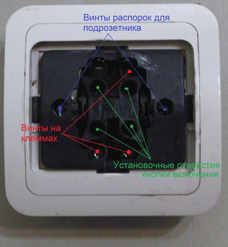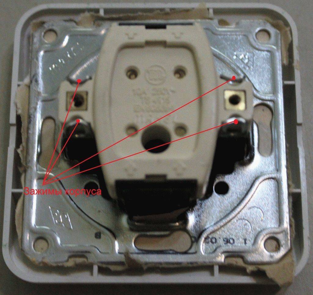 Глядим первый снимок, видим выключатель, сняты кнопки. Корпус вынут из подрозетника. Снимок показывает: типичная схема подключения, 2 клавиши. Цветными линиями показаны, подписаны винты распорок подрозетника, зажимных контактов подходящих проводов. Нужно значительно ослабить крепеж для демонтажа выключателя из гнезда. Потрудитесь предварительно выключить энергию, настоятельно рекомендуем проверить щупом расположение фазы, места прорисовать по кембрику (пластиковая изоляция жилы). Донельзя упростит процесс обратной установки выключателя.