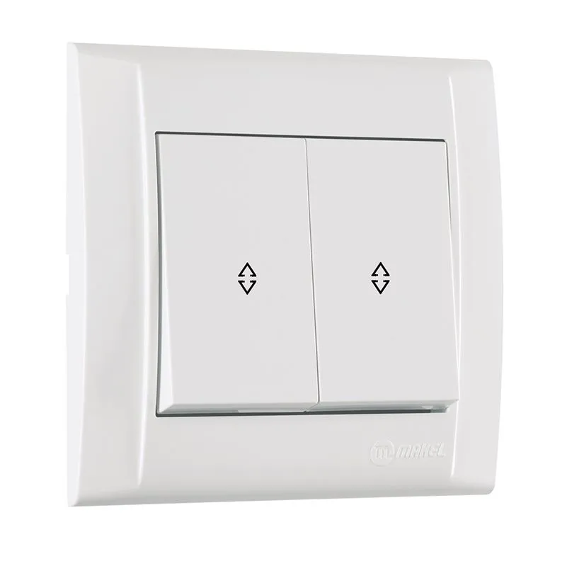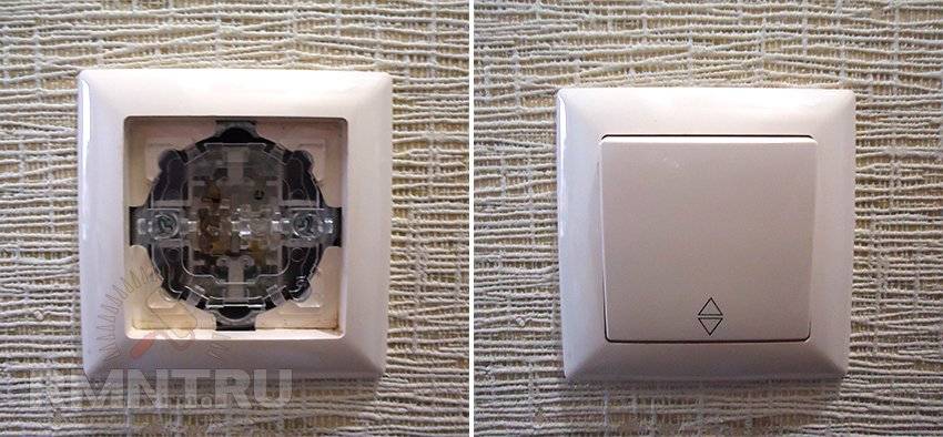 Конструкция проходного выключателя с двумя клавишами напоминает два независимых друг от друга одноклавишных выключателя, но с шестью контактами. Внешне проходной от обычного выключателя не отличить, если бы не специальное обозначение на нем.