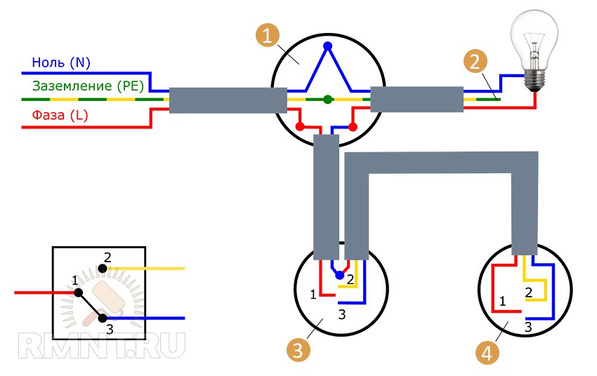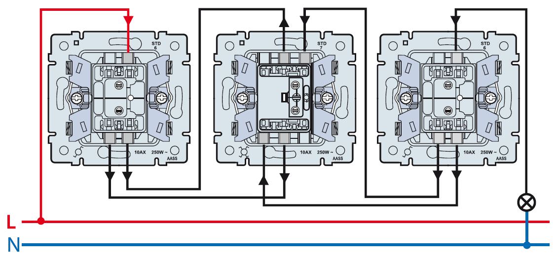 Схема подключения проходного выключателя с 3-х мест