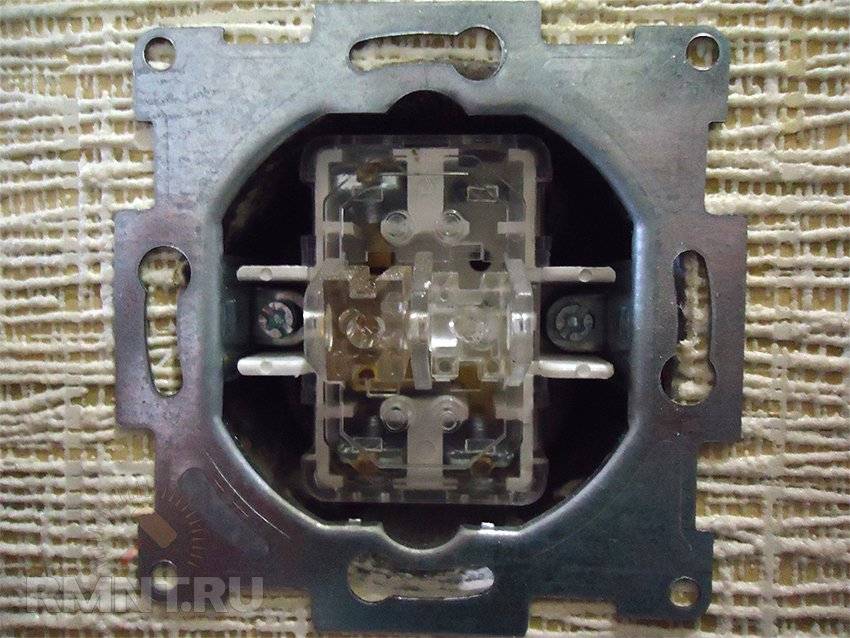 Проходной прибор включения и выключения света внутри имеет четыре клеммы — на вид такой же, как обычные выключатели. Такое внутреннее устройство необходимо для крестообразного соединения двух линий, которые будет регулировать выключатель. Отсоединитель в один момент может сделать расключение двух оставшихся выключателей, после чего их вместе соединяет. Результатом становится включение-выключение света.