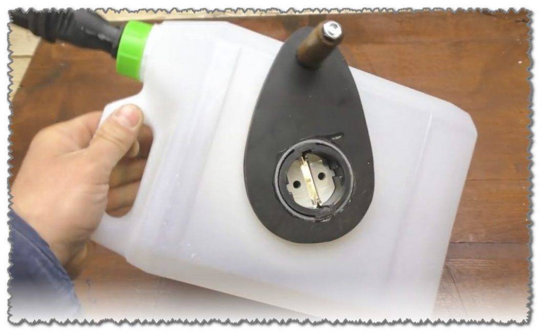 Собираем всю конструкцию: просовываем провод через шпулю, потом через канистру и её крышку. Всё должно получиться так, как показано на схеме ниже.