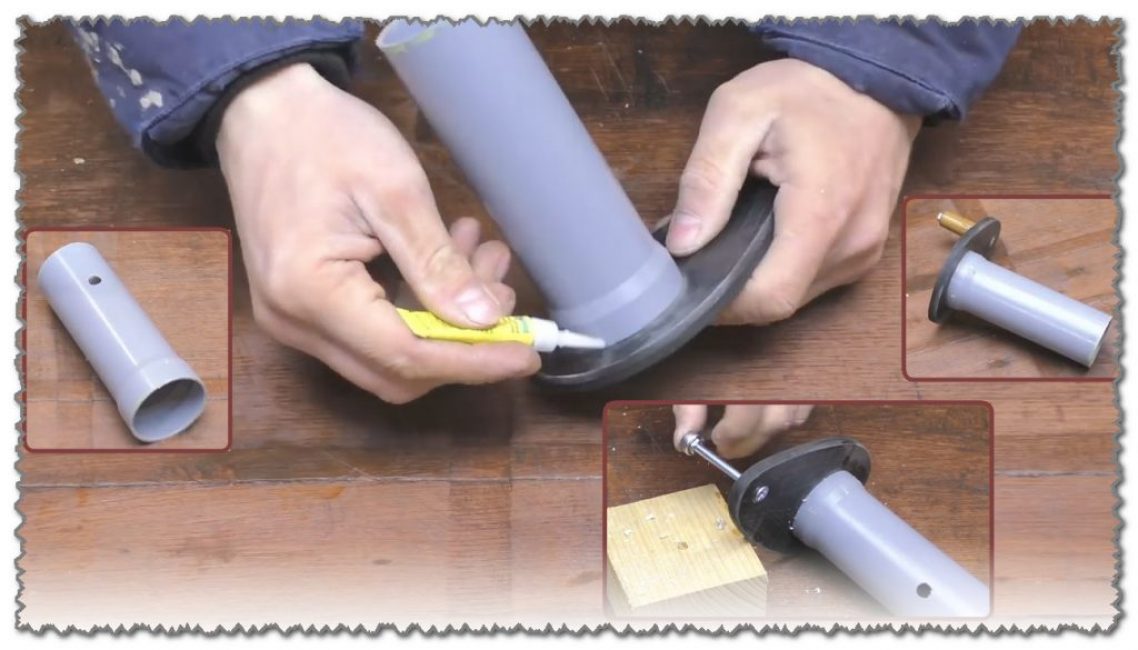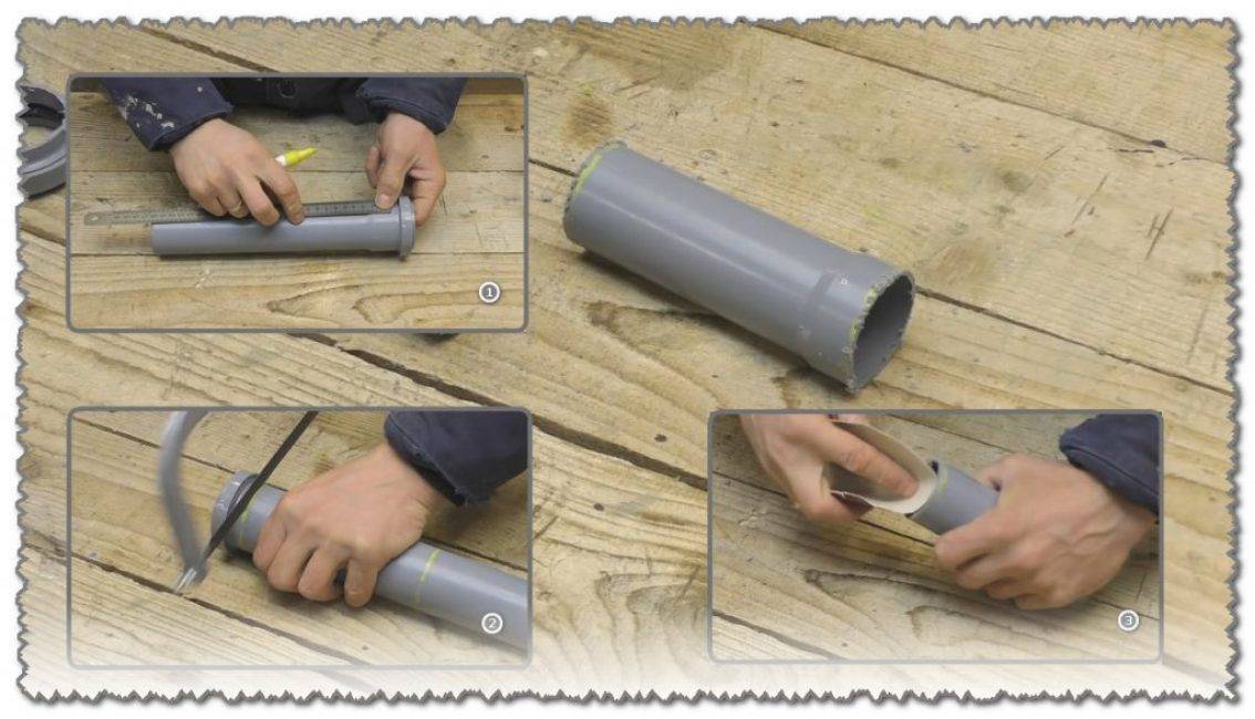 Диаметры отверстий под трубу отличаются, поэтому отмечаем их при помощи подготовленной ПВХ-трубы.