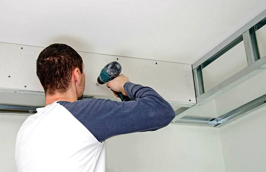 Собранный каркас обшивают гипоскартоном, нарезав его по размерам. Крепят их небольшими саморезами с винтом на конце (TEX 3,5*9,5 мм). Устанавливают крепеж по периметру и в местах, где идут перемычки/стойки, шаг — 20 см. При закручивании надо следить чтобы шляпка чуть утопала в гипсокартоне, но при этом не прорывала картон.