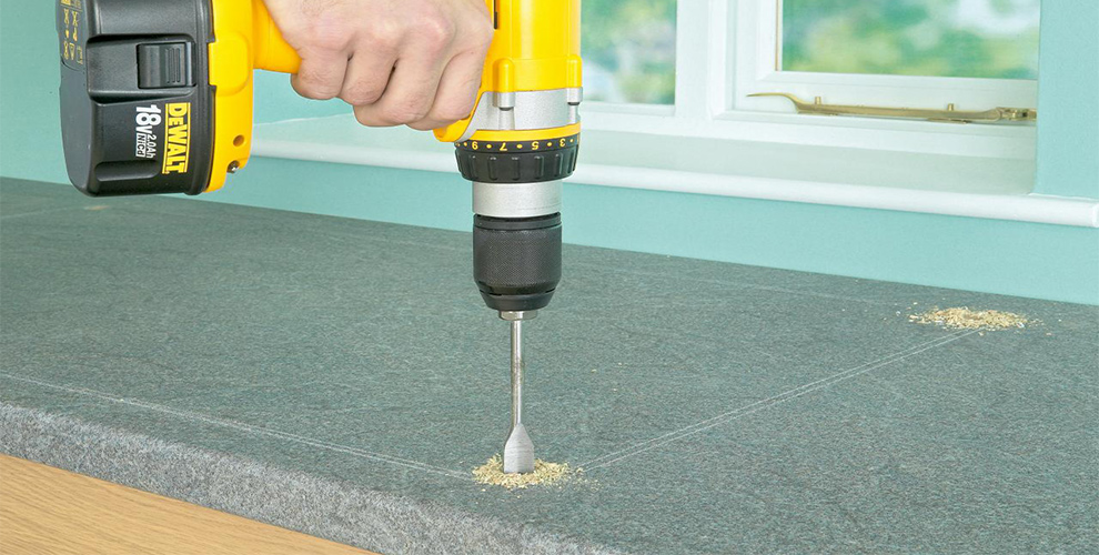 Для того чтобы сделать отверстие в столешнице потребуется электрический лобзик. Он подойдет для столешниц из дерева и ДСП. Если столешница из прочных материалов, то электролобзик не справится. Вначале подготавливают 4 отверстия диаметром в 1 см по углам прямоугольника, не пересекая линию разметки. Затем на лобзик надевается пилка с необходимой длиной зуба (2 мм). Во избежание сколов на лицевой поверхности выбирайте противоположное направление зуба.