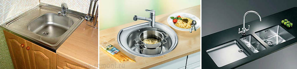 Основные виды кухонных моек показаны на рисунке. Самая распространенная всем знакомая накладная мойка; на рисунке – слева. Она полностью заменяет собой столешницу, способы и особенности ее монтажа хорошо известны и многократно описаны.