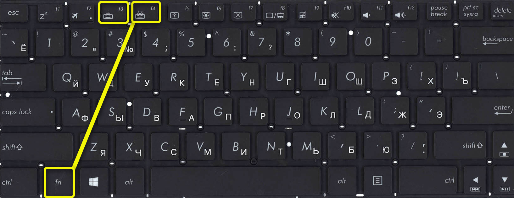 На ноутбуках ASUS чаще всего для управления подсветкой назначено две комбинации клавиш. Fn+F4 включает свет и увеличивает яркость; Fn+F3 — уменьшает яркость и выключает подсветку.