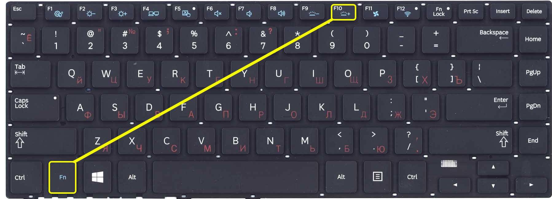 Большинство ноутбуков имеют возможность активировать подсветку клавиатуры, нажимая сочетания клавиш. Вы должны понимать, что лучший способ определить, какая кнопка нужна, — это визуально найти значок, который выглядит как выделение. Обычно нужно нажимать Fn + F1… F12.