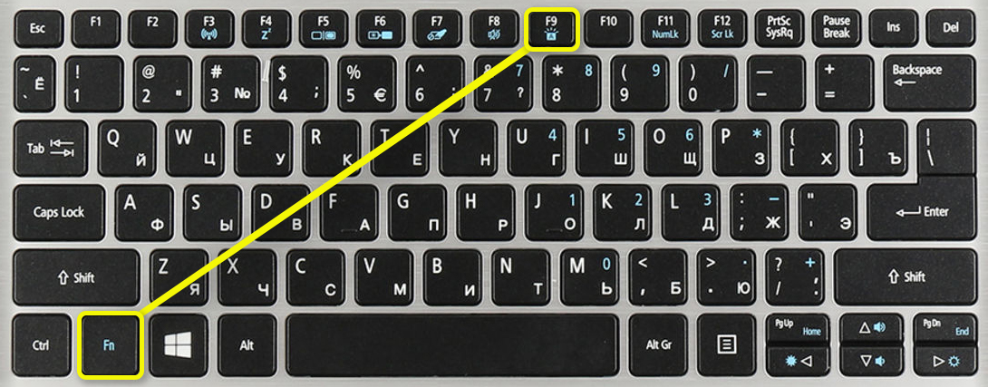Самое распространённое сочетание на ноутбуках Acer — Fn+F9. Первое нажатие включает подсветку, второе — выключает. На кнопке F9 обычно изображена клавиатура, которая как раз говорит о том, что функция поддерживается. Если пиктограммы нет, то велика вероятность, что подсветка на этом ноутбуке не предусмотрена.
