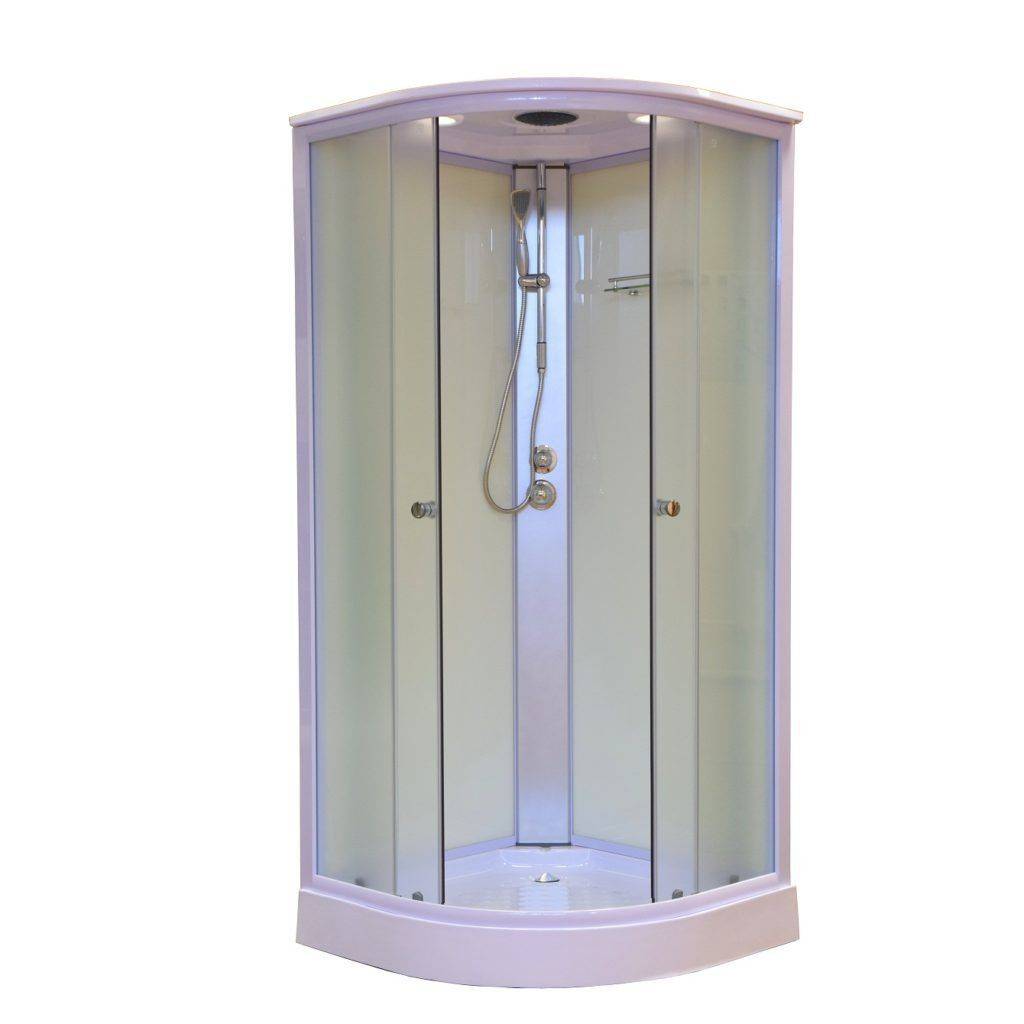 Polar предлагает открытую душевую кабину с поддоном формы одной четверти круга. Эта кабина с ограждением со всех сторон, с двумя створчатыми раздвижными дверями, выполненными из полупрозрачного стекла. В комплекте стандартный набор: смеситель, душевая лейка и полочка.