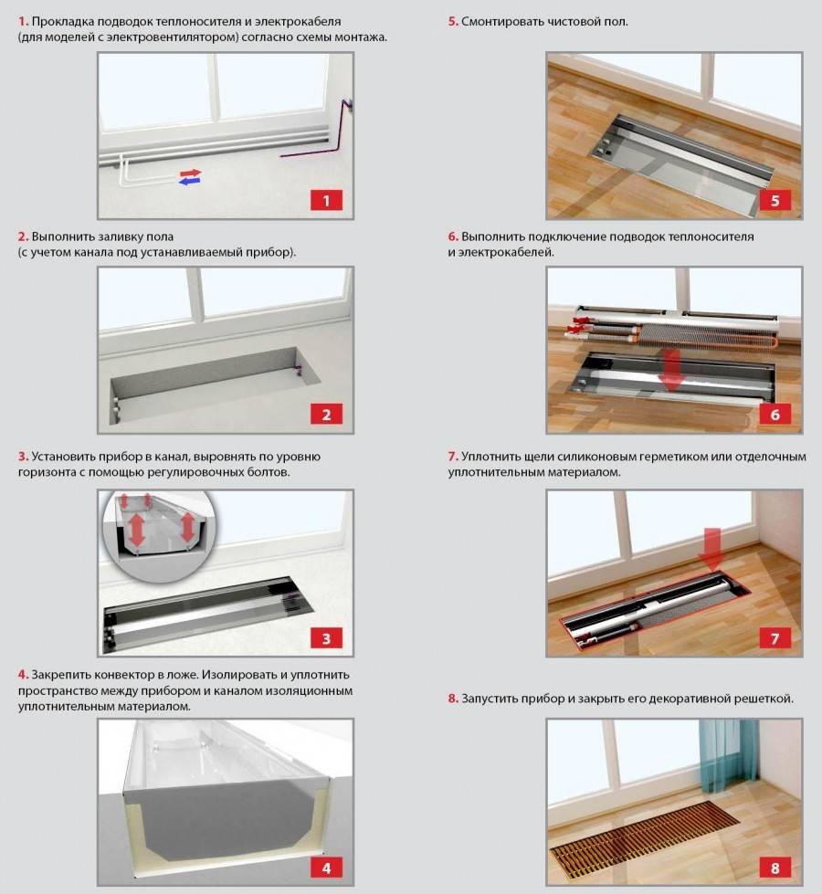 Лучше всего установить конвектор под окном, тогда холодный воздух не будет попадать в помещение. Высота от пола и зазор до стены должны быть примерно по 20 см.