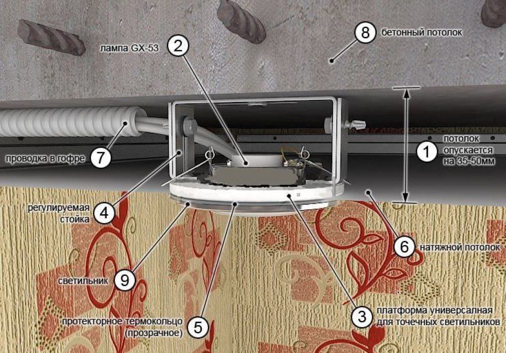 Точечные светильники и накладные люстры крепят к площадке, которую устанавливают заранее. После монтажа полотна в нём прорезают отверстие, предварительно укрепив ПВХ-плёнку термокольцом, и устанавливают прибор. Поэтому расположение светильников на потолке необходимо распланировать заранее.