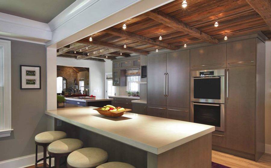 Главное, чтобы освещение было достаточным и отвечало дизайнерской задумке. Например, массивная подвесная люстра со свечами или канделябрами будет хороша для кухни в классическом стиле, которую можно обустроить лишь в свободном помещении. В современных интерьерах она внесёт диссонанс в окружающее пространство, поскольку в них более уместны припотолочные конструкции в одной стилевой направленности с внутренним убранством.