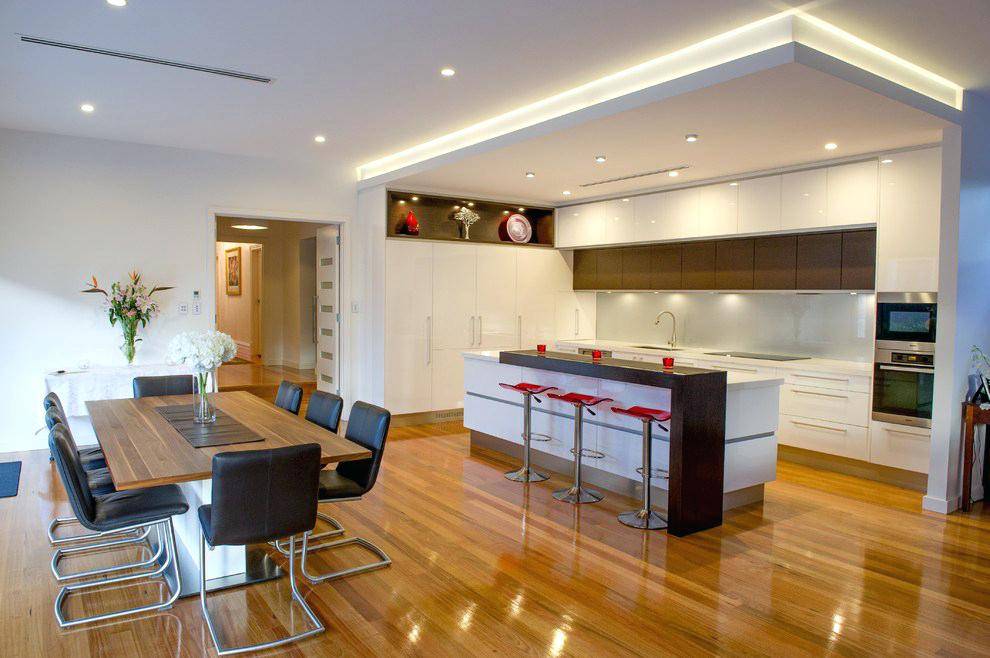 Современное оформление интерьера кухни с использованием точечных светильников и светодиодной подсветки