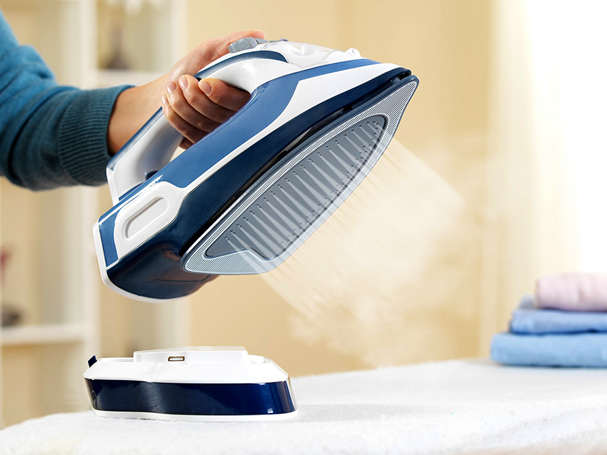 Tefal FV9976. Считается лучшим утюгом для дома (рейтинг 2019 года) в категории наиболее мощных беспроводных приборов. Благодаря своей автономности модель удобно использовать для вертикального отпаривания вещей, а отсутствие шнура позволяет легко работать с маленькой детской одеждой или такой, которая отличается непростой формой. Все ранее выпущенные беспроводные модели характеризовались невысокой мощностью, но инженеры Tefal смогли исправить ситуацию и создать утюг мощностью 2600 Вт с максимальным паровым ударом 200 г/мин. При этом скорость зарядки при установке на базу не превышает 4 секунд. Особенности эксплуатации: