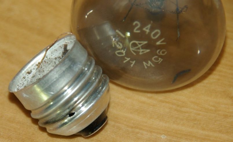 Другой проблемой является воздушный зазор между цоколем и патроном, в котором образуется микроскопическая электрическая дуга. Постепенно металл оплавляется и создается сварная точка, при попытке выкручивания лампы колба отрывается от основания. Третьей причиной является повышенное напряжение в цепи питания, вызывающее интенсивный разогрев вольфрамовой спирали и разрыв колбы внутренним давлением.