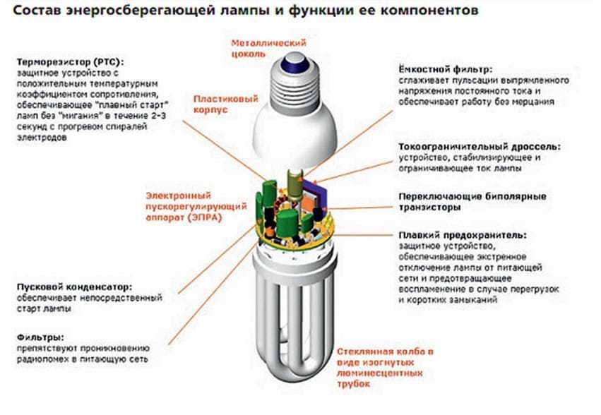 Энергосберегающие лампы состоят из цоколя, колбы и пускового устройства. Колбы ламп наполняются парами ртути или инертного газа аргона. Белое вещество на стекле колбы является люминофором. Он же используется и в люминесцентных видах ламп.