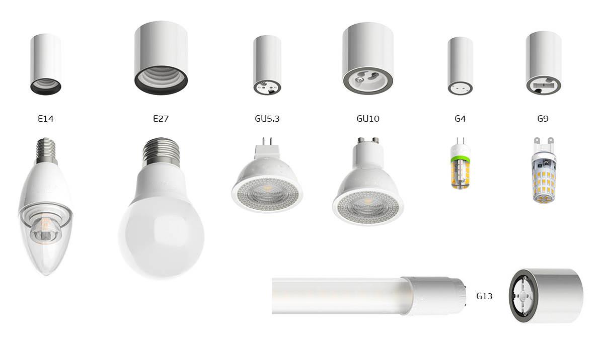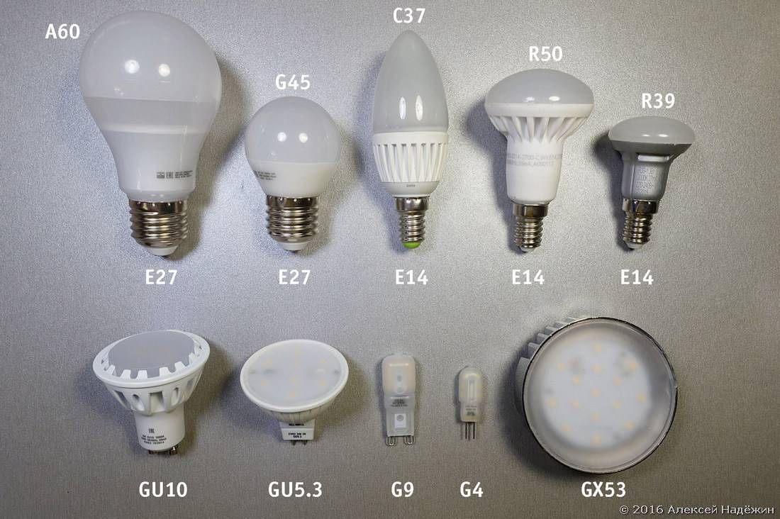 Светодиодные лампы выпускаются в различных корпусах с разными типами цоколей. Это и обычные «груши», «свечки» и «шарики» с цоколями E27 и E14, и «зеркальные» лампы R39, R50, R63 и софиты с цоколями GU10 и GU5.3, капсульные лампы с цоколями G4 и G9, лампы для потолков с цоколем GX53.