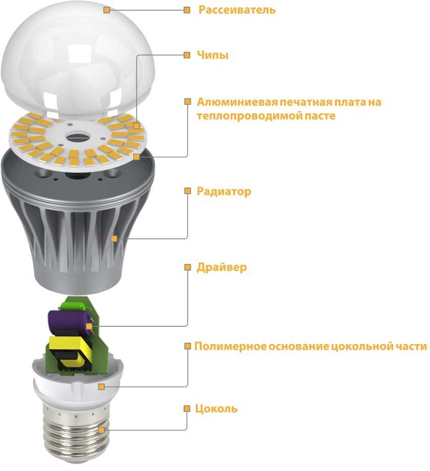 Светодиодная лампа по внешнему виду не отличается от традиционного источника света. Конструкция устройства представлена стандартным цоколем с обычной резьбой. Поэтому лампа может быть использована для обычных патронов, что исключает надобность изменения электрооборудования помещения. Однако данные устройства имеют существенные отличия по внутренней комплектации.