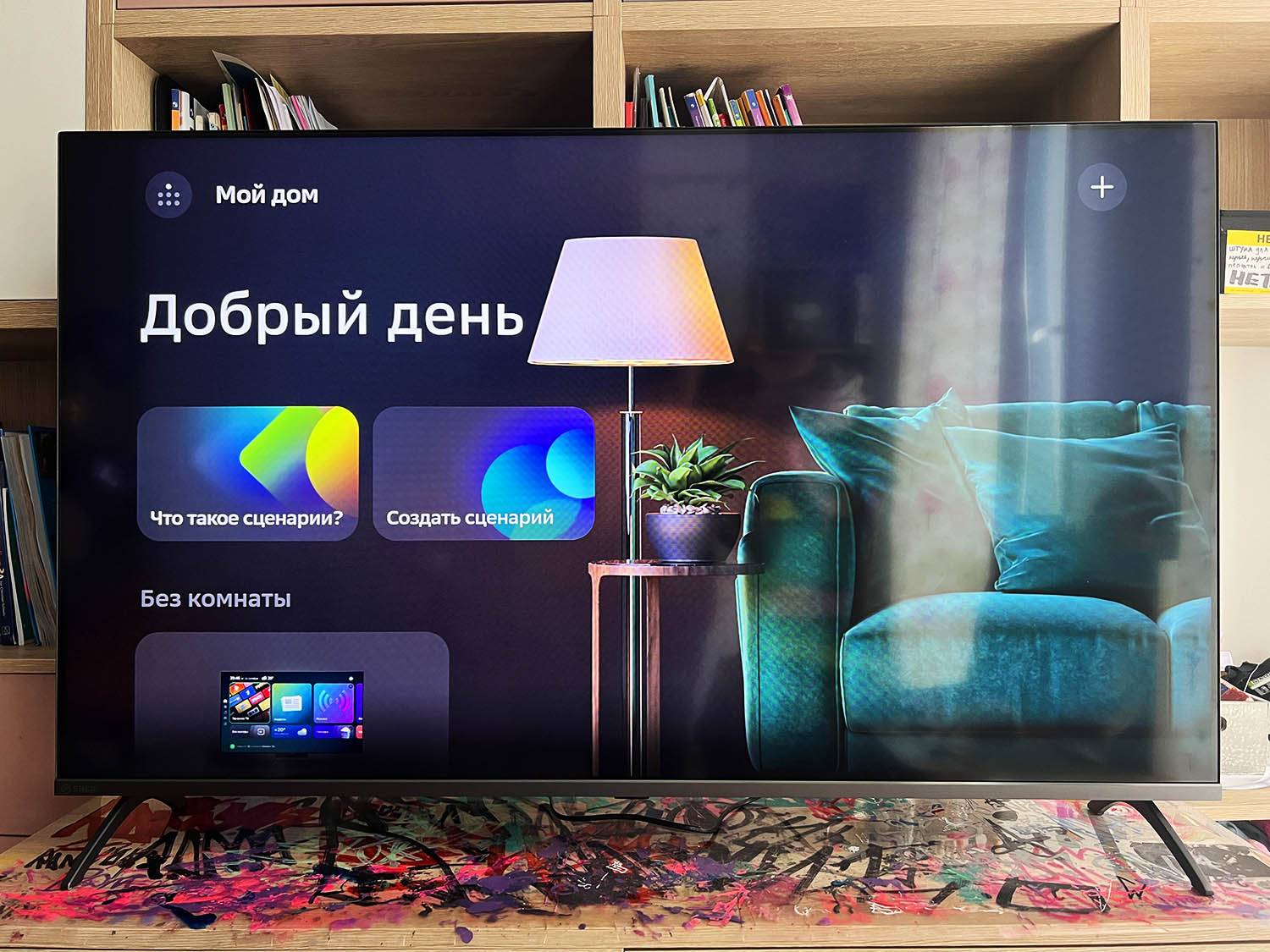 Телевизоры без умной начинки сейчас не встретишь. Так и здесь есть полноценная система для просмотра эфирного ТВ, онлайн кинотеатров и другого контента с подключенных носителей. Это уже хорошо знакомая россиянам по гаджетам SberBox и SberBox Top открытая платформа — Салют ТВ. Управлять устройством можно при помощи пульта ДУ, через фирменное приложение на смартфоне или просто голосом.