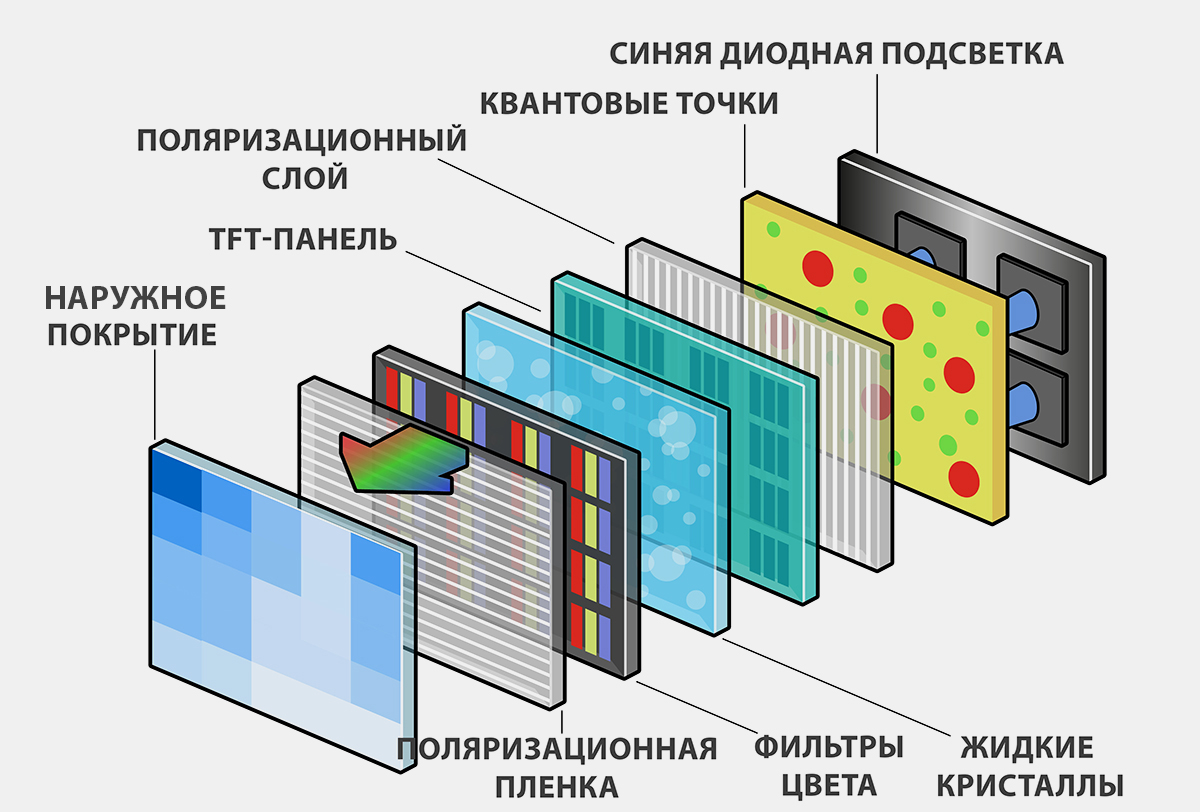 Это принципиально иной способ устройства матрицы, который сочетает в себе преимущества LCD и LED. Вместо органических кристаллов он основан на специальных квантовых точках, которые под воздействием тока или света сами начинают светиться. Цвет точки зависит от используемого материала и её размера. Например, точка побольше будет излучать красное свечение, а самая компактная — синее.