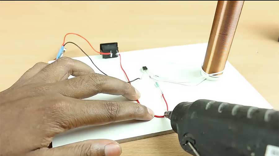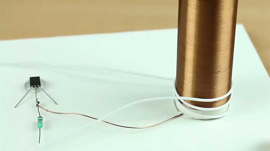 После соединяем все воедино. К плюсу источника питания подсоединяем первичный контур и один резистор, к которому последовательно подключаем другой резистор. К концу второго резистора подключаем вторичный контур и транзистор. Другой конец первичного контура подключаем ко второму контакту транзистора. А третий контакт транзистора подключаем к минусу источника питания.