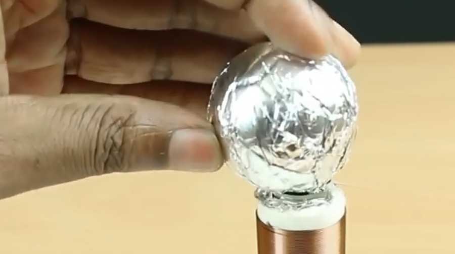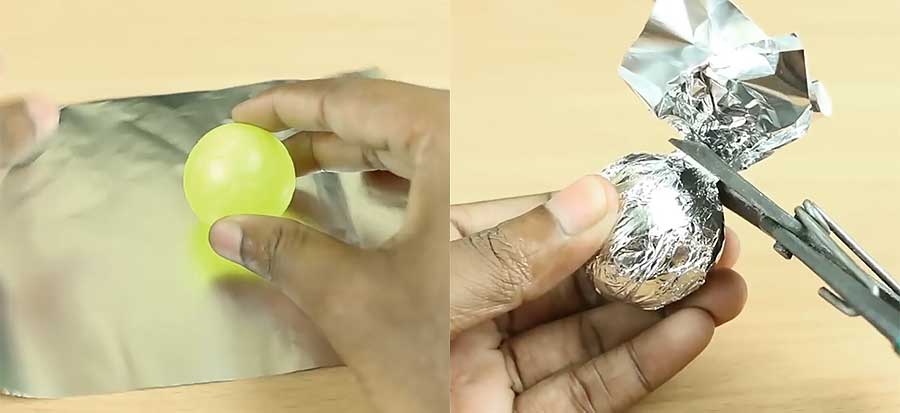 Теперь нам предстоит изготовить последний элемент трансформатора Тесла — излучатель. Его можно сделать из теннисного шарика, обернутого пищевой фольгой. Для этого берем кусок фольги и просто оборачиваем в неё шарик. Обрезаем лишнее, чтобы шарик был ровно завернут в фольгу и ничего не торчало.
