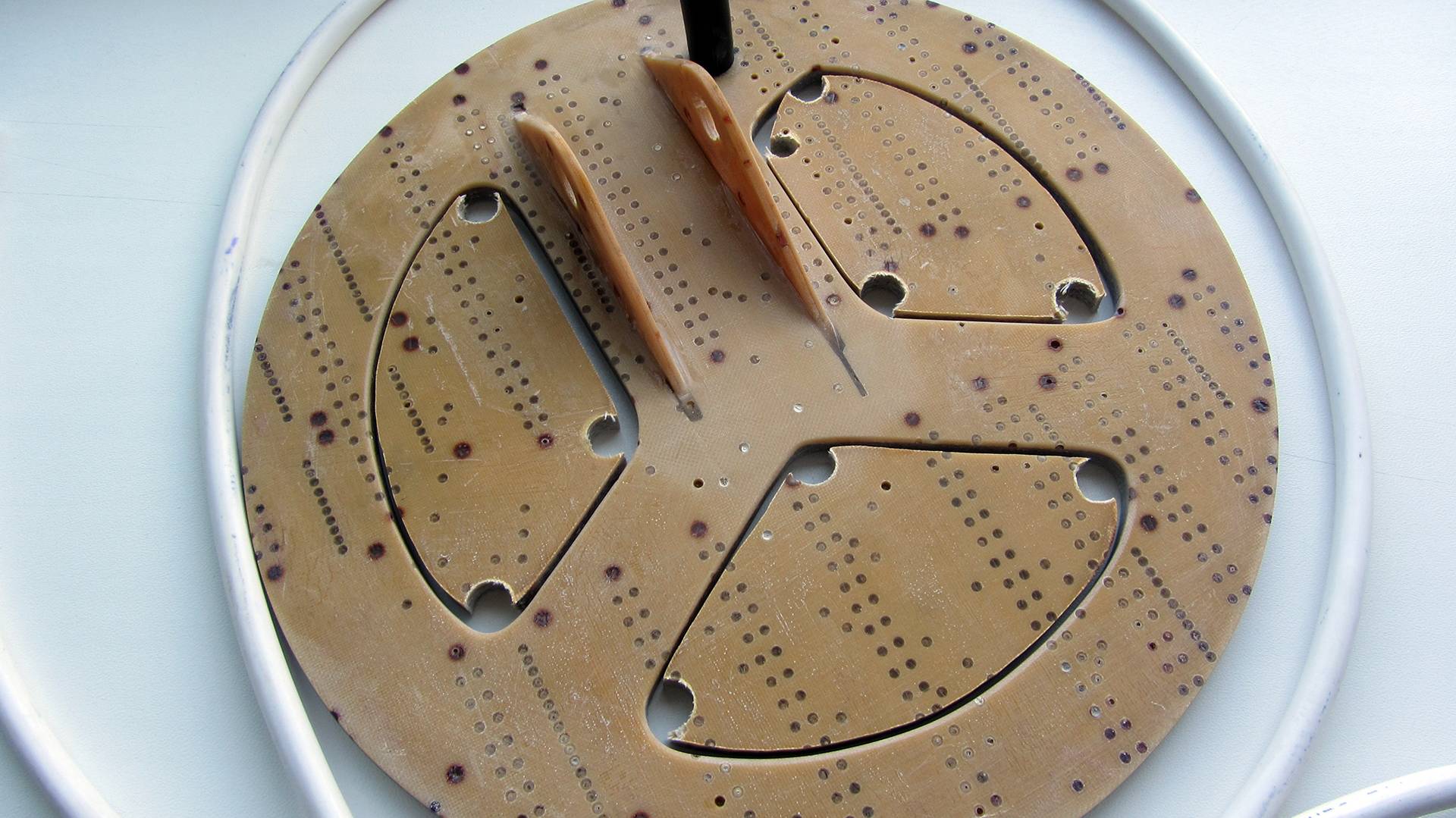 Теперь задним умом понимаю, как можно было изготовить катушку еще немного легче. Для этого надо было заранее наделать больших отверстий в среднем блинчике (перед тем, как все склеивать). Что-то типа такого: