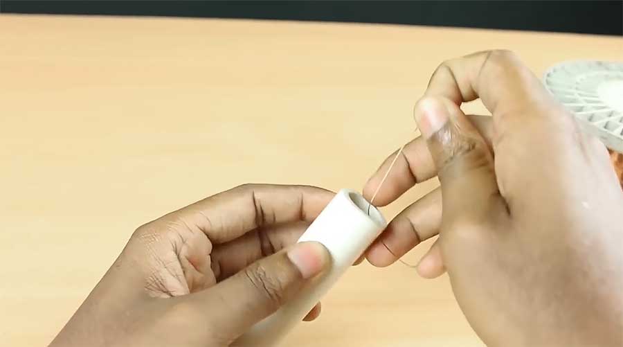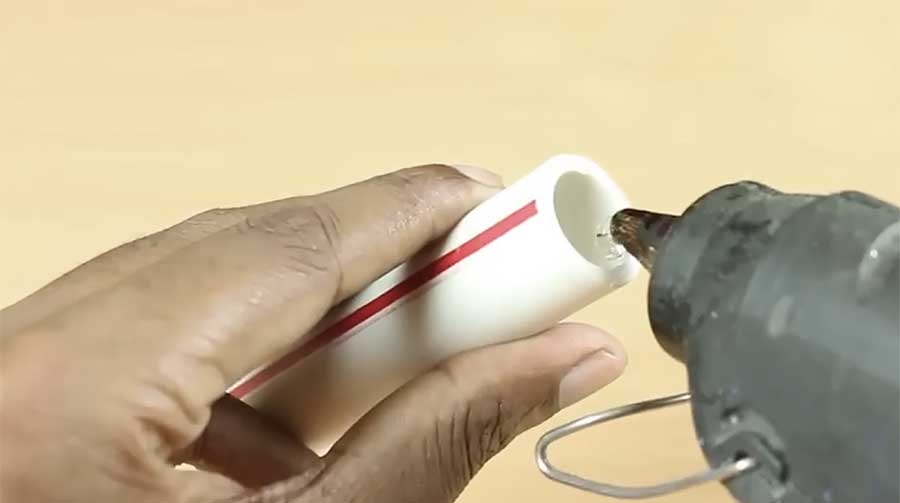 Фиксируем этот конец провода с помощью клеевого пистолета. Фиксацию производим с внутренней сторона трубы.