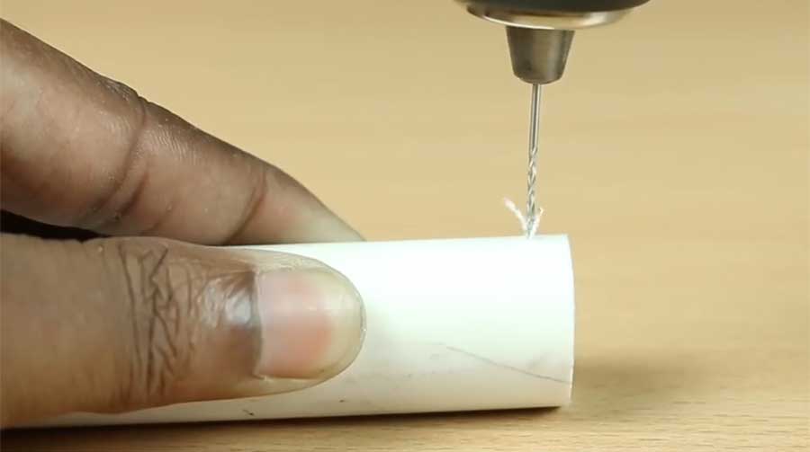 С двух концов трубы надо просверлить по одному отверстию. Диаметр этих отверстий должен быть такой, чтобы проволока, которую мы будем использовать при намотке, свободно прошла туда. Т.е. это должны быть маленькие отверстия. Если у вас нет такого тонкого сверла, то можно пропаять трубу, используя тонкий гвоздик, нагревая его на плите.