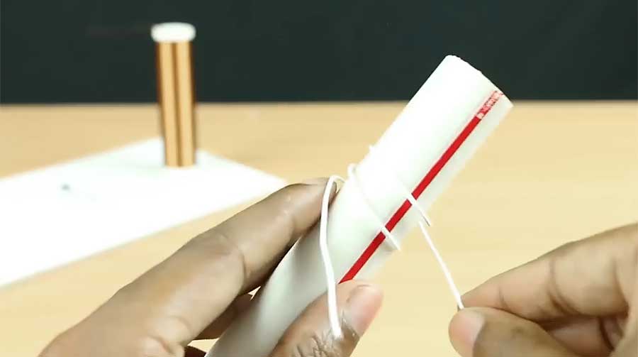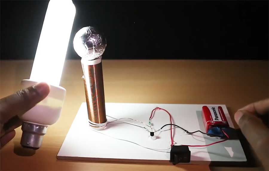 Теперь осталось только проверить работоспособность изготовленного нами трансформатора Тесла. Для этого надо включить устройство, взять в руки люминесцентную лампу и поднести к катушке. Мы должны увидеть, как загорается и горит поднесенная лампа прямо в руках!