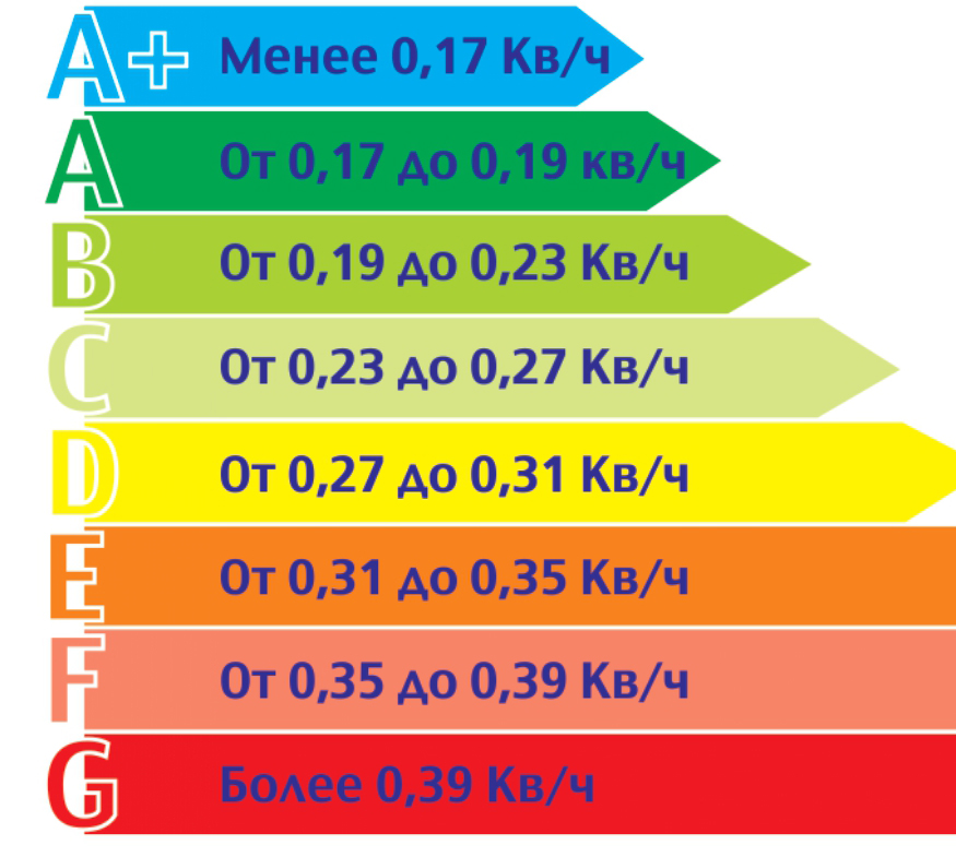 При приобретении техники нужно ориентироваться на класс и категорию энергетической эффективности. Приведем детальные расшифровки буквенных символов, которые обозначают классы энергопотребления: