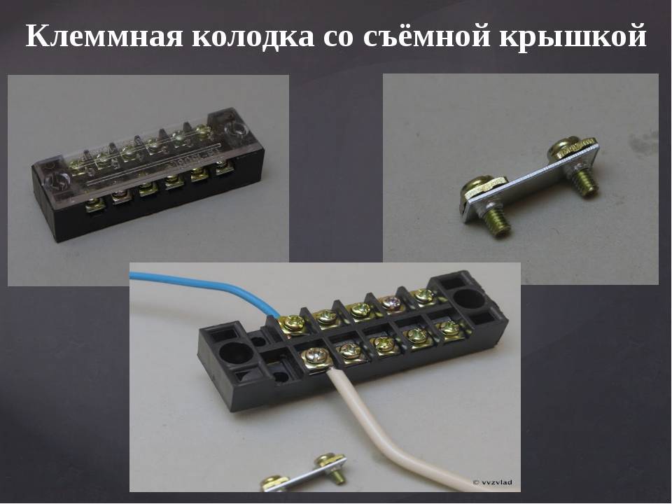 Проходными называют клеммные колодки, предназначенные для попарного сращивания проводов. Это самый распространенный вид и именно о нем мы все время и говорили. В корпусе запаяна контактная пластина, к которой с двух сторон подключаются проводники.