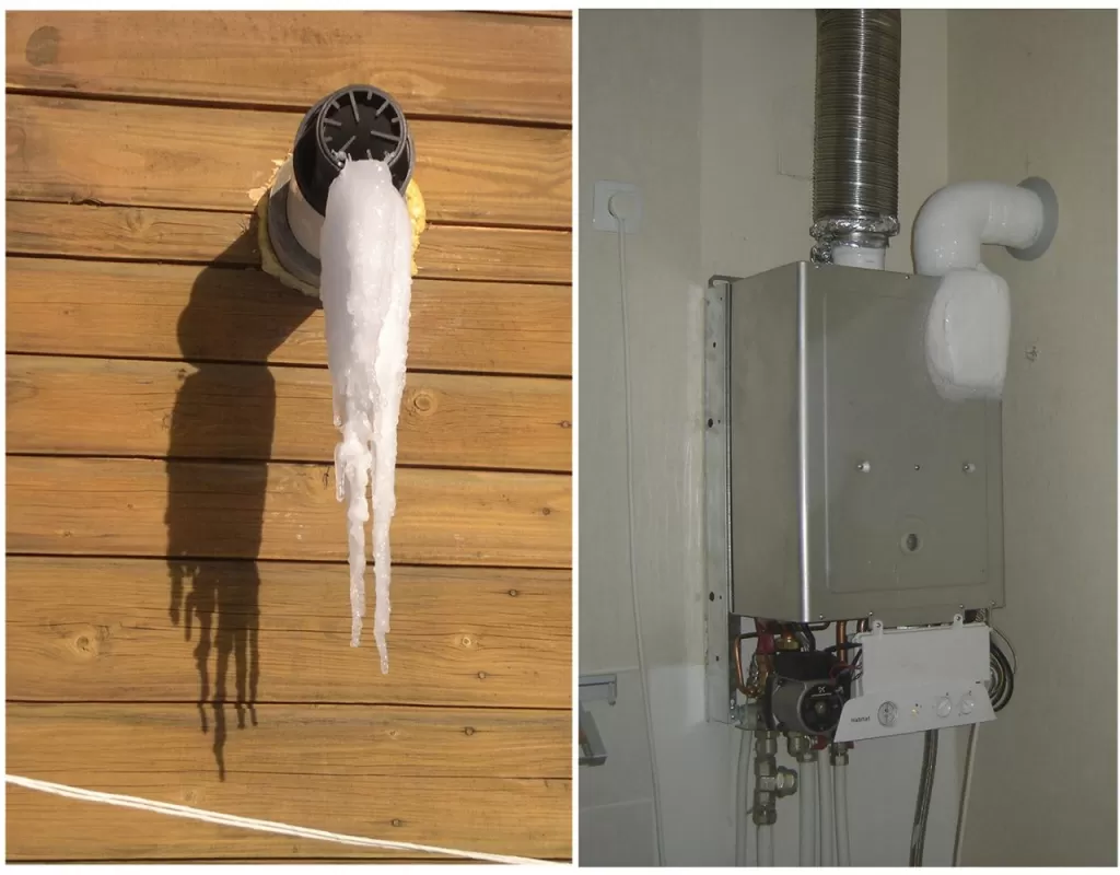 - Ограничения на вывод через фасад. Необходимо тщательно соблюдать запрет на стекание конденсата на землю. Трубу устанавливают под уклоном к котлу. Если присутствует конденсатоотводчик, допускается сделать уклон выходного патрубка к грунту, для отвода дождевой воды. При коллективном подключении потребуется согласовать утилизацию скопившегося конденсата, в органах санэпиднадзора.