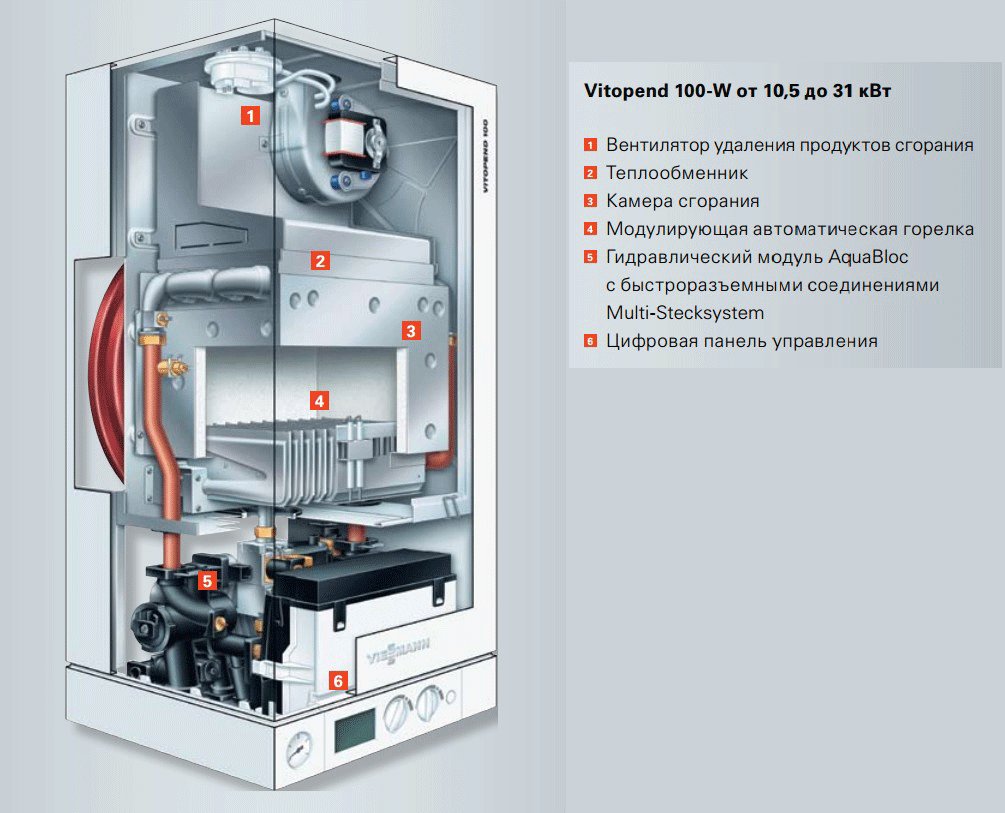 Аппарат Виссман Витопенд 100 В с одним контуром оборудован системой Aqua-Block с мультиштекерным соединением Multi-Stecksystem от фирмы Grundfos. Производится в двух исполнениях с камерой сгорания закрытого типа (модель «турбо») и с забором воздуха для горения из помещения (модель «Атмо»). Турбированный котел оборудован коаксиальным дымоходом и вентилятором со сниженным уровнем шума для выведения сгоревшего топлива.