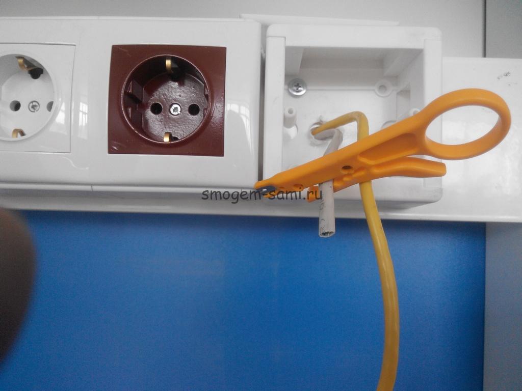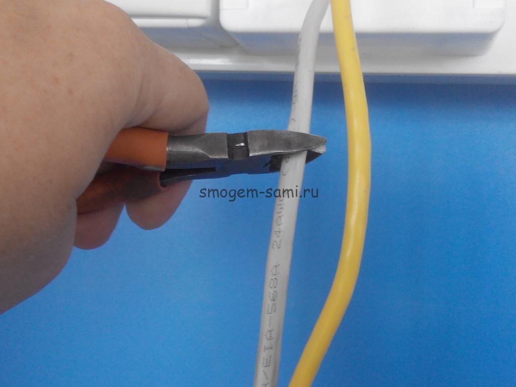 - Отрезаем излишки кабеля, оставив 100 – 150 миллиметров. Этого запаса хватит на случай, если в будущем понадобятся изменения в проводке.