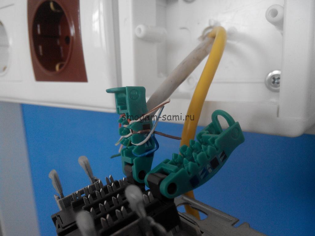 Когда провода соединены, клеммник возвращают в розетку, в стопорное кольцо надежно закручивают