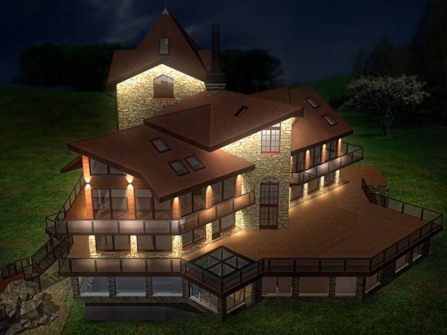 Важно учесть и схему расположения дома, ведь освещение должно хорошо смотреться на фоне подсветки соседних зданий. Чтобы создать контраст между фоном и фасадом дома, следует организовать и уличное освещение двора, причем – особым образом. Не менее важен правильный подбор светильников, прожекторов, иных осветительных приборов, а также расчет их количества