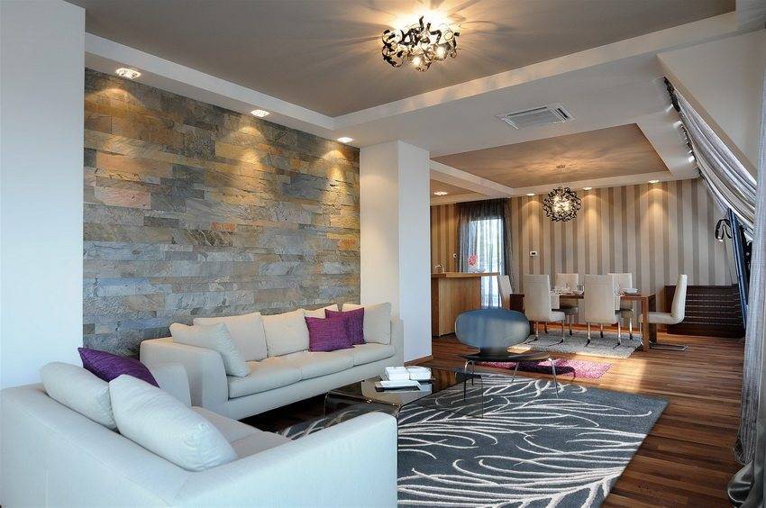 Также важно продумать дизайн, цвет и материал светильников так, как помимо основной функции, освещение играет декоративную роль в интерьере. Разнообразить обстановку просторной комнаты и сделать ее более уютной можно за счет необычных накладных точечных изделий