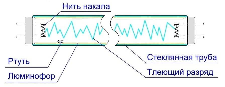 Люминесцентный источник света классической конструкции представляет из себя герметичную колбу, заполненную инертной газовой средой (чаще используется аргон) с небольшим количеством ртути. По краям источника находятся два электрода, которые осуществляют розжиг, а затем поддерживают дальнейшее горение.