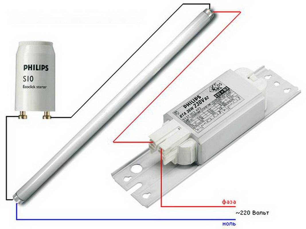 Схемы включения ламп дневного света подразумевают наличие электромагнитного пускорегулирующего аппарата или дросселя (представляющего собой своеобразный стабилизатор) со стартером. Конечно, в наше время есть люминесцентные лампы без дросселя и стартера и даже приборы с улучшенной цветопередачей (ЛДЦ), но о них чуть позднее.