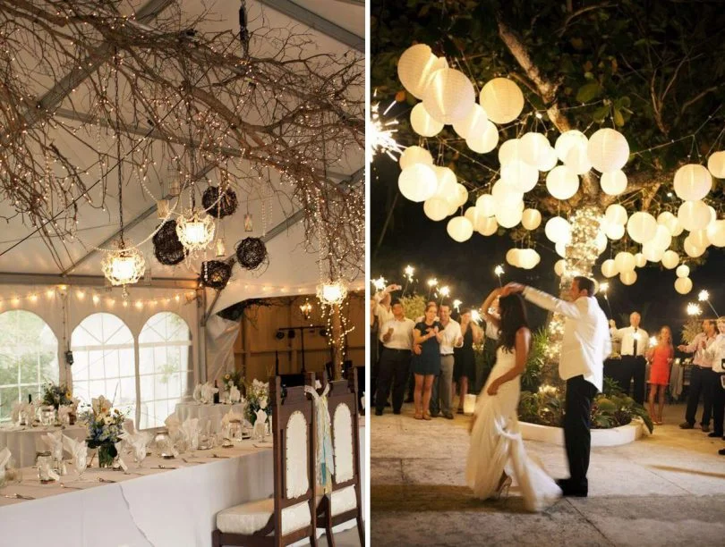 Вполне достойной альтернативой дизайнерской работе могут стать грамотно развешенные по территории недорогие гирлянды и лампочки в необычных абажурах.