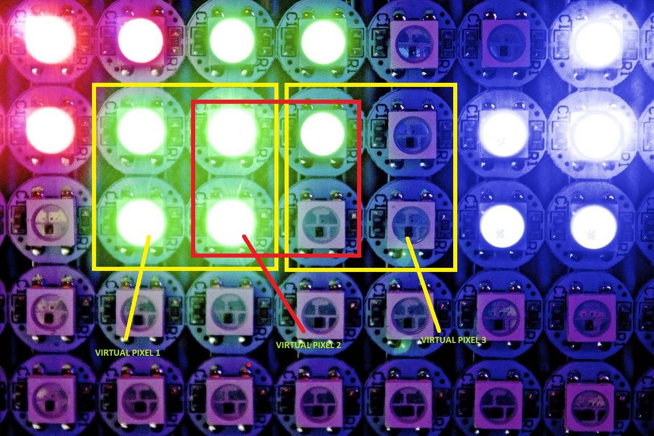 Светодиоды на экране соответствуют пикселям, однако в отличие от жидкокристаллических LCD экранов, пиксели светодиодных экранов виртуальные, т.е. один и тот же цветной светодиод может быть частью нескольких виртуальных пикселей. Такая особенность позволяет получать в два раза более высокое разрешение изображения.