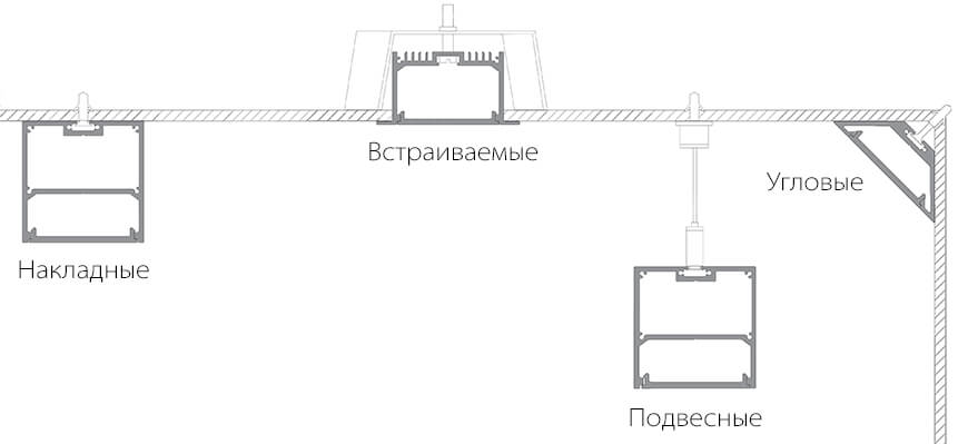 По способу монтажа все существующие на сегодня светодиодные линейные осветители можно разбить на три класса: