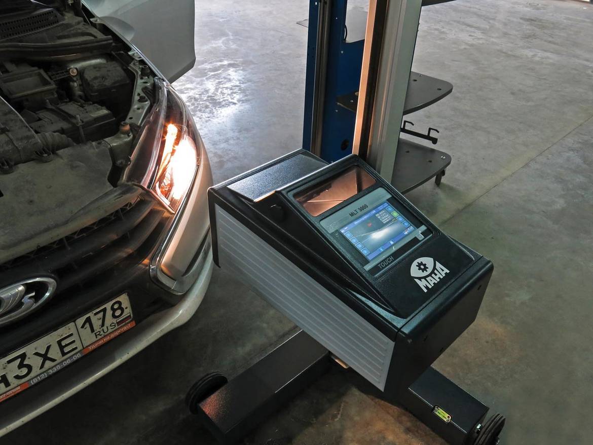 Испытания проводились на левой фаре серийно выпускающегося автомобиля Lada Vesta. Автомобиль был поставлен на специальную ровную поверхность без уклонов, вначале была произведена проверка уже имеющейся лампы и произведена небольшая регулировка согласно рекомендациям, выданным прибором.