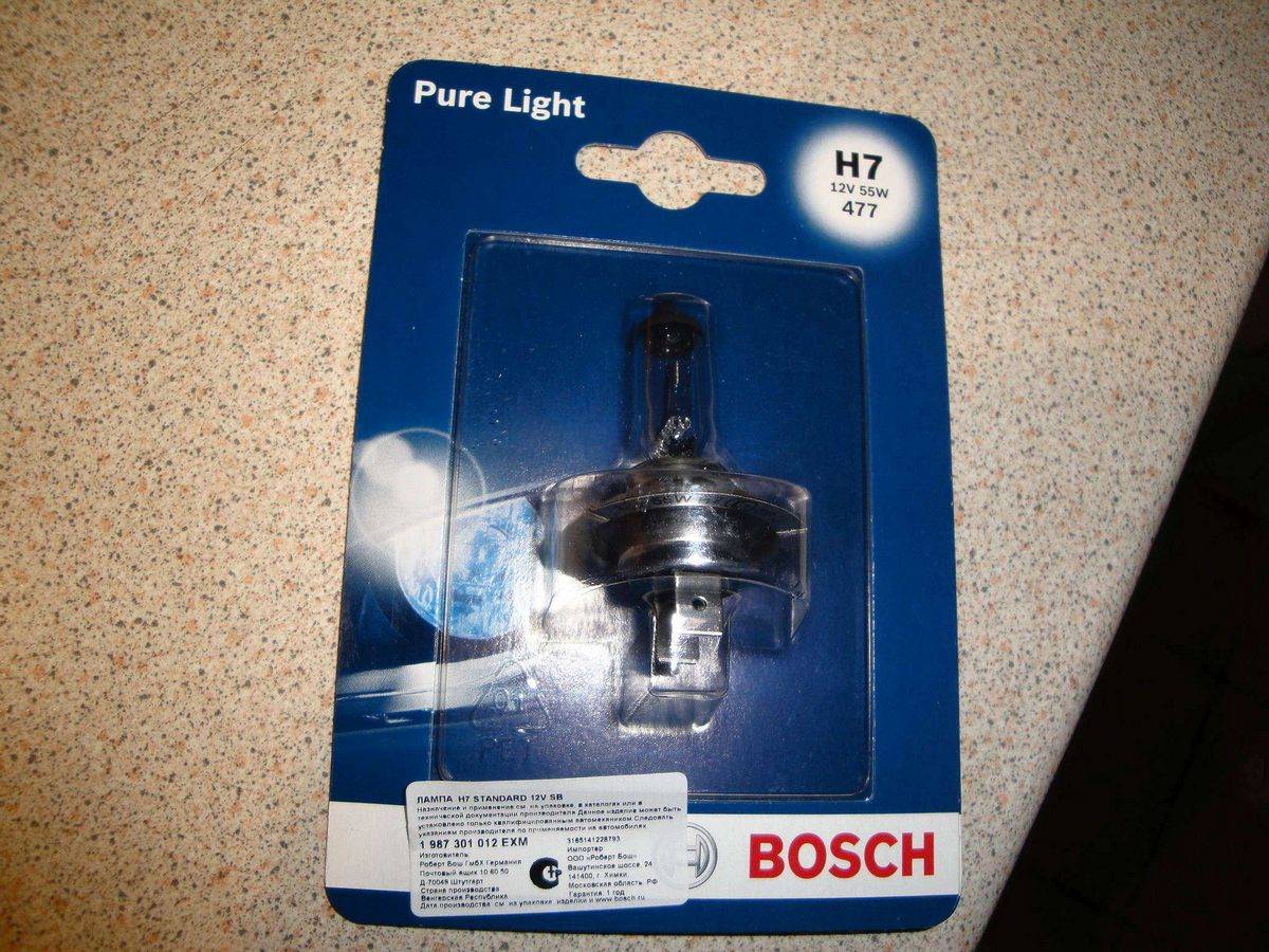BOSCH Pure Light 1987301012 H7 12V 55W – недорогая галогенная лампа для автомобиля. Вот ее характеристики: