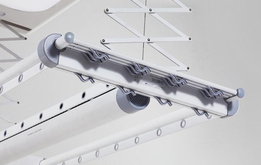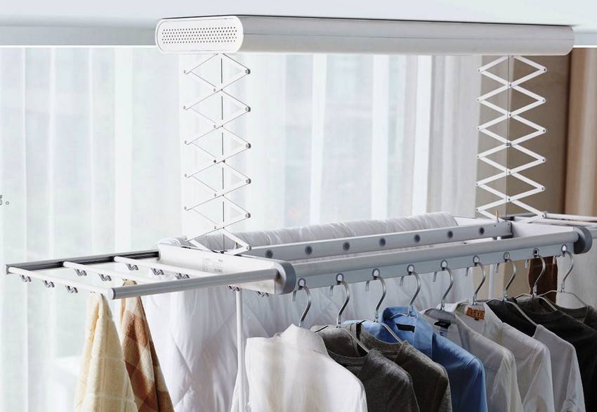 Дистанционное управление осуществляется посредством пульта, что делает использование сушилки еще более комфортным. Пульт управления не только регулирует подъем планок с веревками, но и осуществляет включение и выключение лампочек. Еще более современные модели сушилок дополнительно оснащены фенами и ультрафиолетовыми лампами.