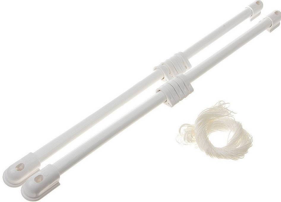 - Подготовительный этап. В штанги необходимо заправить веревки для белья. К каждой планке должны быть прикреплены 2 веревки: короткая и длинная.