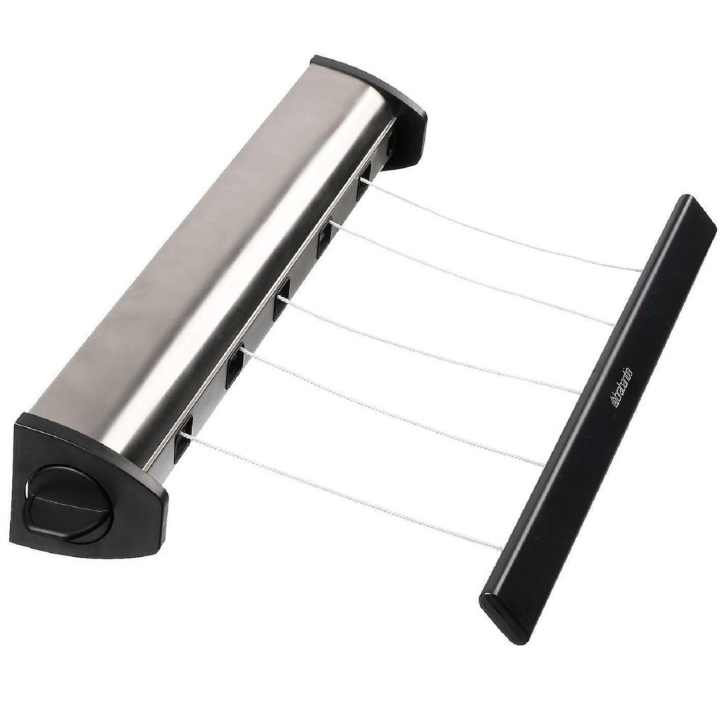 Сушильная машина Brabantia прочная и надежная, устанавливается между стеной и потолком. Корпус изделия выполнен из металла и оснащен прорезью, через которую продеваются веревки. Рабочая часть выдвигается на 4,4 метра, что позволяет развесить белье для сушки в упорядоченном порядке. Brabantia имеет ограничитель натяжения каната. Максимальная нагрузка может достигать 12,5 кг.